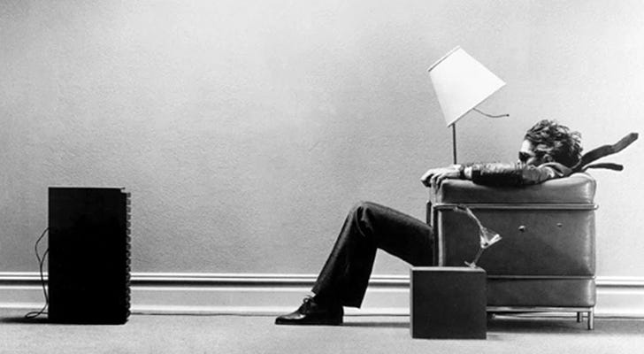 So until the next post I’ll leave you with my favorite artwork; Maxell’s “Blown Away Guy” (pictured below). The man is shown desperately clinging to the armrests but defiantly looking ahead at the source of the music through his sunglasses while his hair, necktie, the lampshade and his martini glass are being blown back by the tremendous sound from speakers in front of him supposedly due to the audio accuracy of Maxell’s product. Can’t think of a better metaphor for the paradigm we are in.